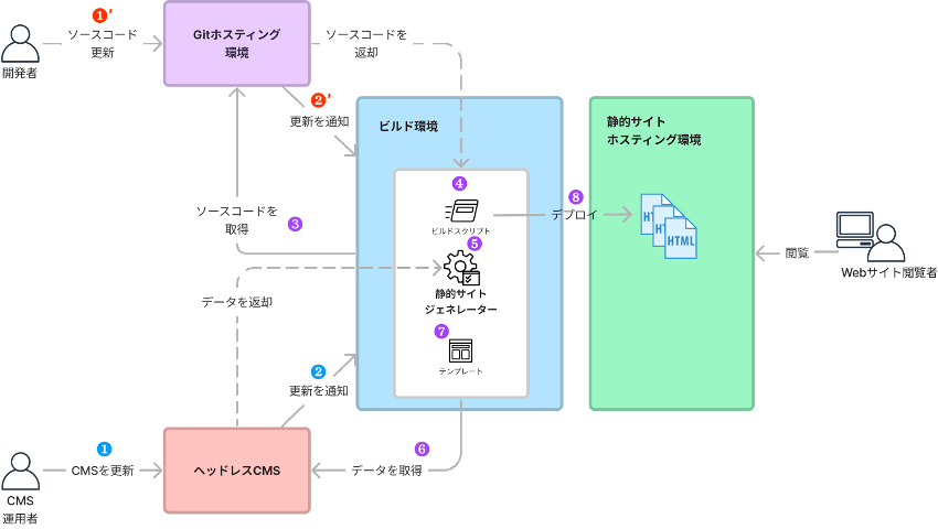 静的サイトが生成される起点として、一般的には「CMS更新」と「ソースコード更新」の2つがあります。