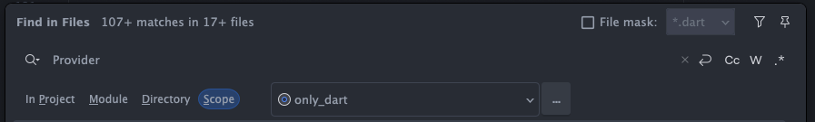 Find in Files の Scopeで今回作成した「only_dart」を選択すると、検索対象を自動生成されていないDartファイルに絞り込むことができます。